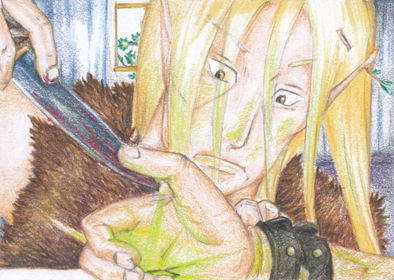 | Doch sein siebter Sinn hatte ihn diesmal getäuscht. Dies war kein Unterschlupf. Es war ein sehr geräumiges, helles und aufgeräumtes Behandlungszimmer – und es war bewohnt. Von dem Bewohner ging keine Gefahr für den Elfen aus. Als gut verschnürtes Bündel lag er auf eine Bahre gefesselt da. Der Waldbewohner wich trotzdem sogleich zum Fenster zurück, denn der Mensch zuckte unruhig und gab gequälte Laute von sich. Was hatte es? Der Elf legte den Kopf schief und tastete sich Schritt für Schritt vor. Erst, als er direkt an der Bahre stand, bemerkte ihn der Patient – er stieß einen entsetzten Schrei aus, fast zornig. Der Elf stach zu, der Mann war sofort tot. |