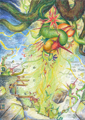 Er breitete sich aus und riss auch die Wände und das Dach der Nervenheilanstalt auseinander. Zwischen Balken, losen Ziegeln und weithin in der Stadt sichtbar, begannen sich giftig grüne Ranken zu winden, platzten stachelige Fruchtstände auf und verschafften sich Platz in dieser Welt. Bewohner einer anderen Ebene manifestierten sich in dieser und liefen in alle Richtungen. Zwei Stockwerke tiefer fragte sich Mellagan, was denn nun schon wieder geschehen war.