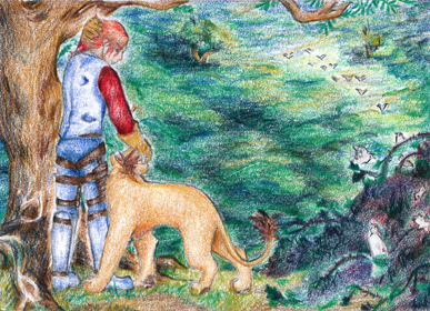Ein Blick zurück zeigte ihm, dass das Tier ihm noch immer folgte. Aus irgendeinem Grund war es ihm wohlgesonnen. War es ein treuer Freund, der sich Sorgen machte und den er genauso vergessen hatte, wie alles andere? Das wäre unverzeihlich. Die grünen Augen schauten ihn aufmerksam an. Das Tier war äußerst anhänglich. Sobald er stehen blieb, kam es heran und schmiegte sich an seine Seite. Wenn er den Weg verloren hatte, ging es voraus. |