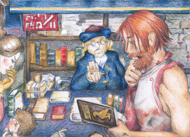 Der Bücherverkäufer und die Dame drehten sich zu ihm um, als sie den unangenehmen Duft wahrnahmen, der von ihm ausging. Während sich die Dame die Nase zuhielt und sich schnell entfernte, brach der Verkäufer in empörtes Gezeter aus, in das er sich immer mehr hineinsteigerte. Während der Reiter mit allen möglichen unschönen Beschimpfungen beworfen wurde, damit er sich woanders hinbegebe und nicht mehr mögliche Kunden vergraule, tastete der in seinem zerschlissenen Hemd nach einem Band, an dem ein kleiner Beutel hing. Er fand ihn, langte hinein und bezahlte das Buch, das er in Händen hielt, indem er wortlos eine goldglänzende Münze auf den Tisch legte. Dann kam er dem Wunsch des Bücherhändlers nach, der inzwischen verstummt war und äußerst verwundert das Geld (es war viel zu viel) betrachtete. |