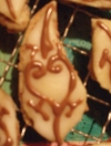 160° backen. Für den Belag Marzipan und Puderzucker miteinander vermengen, ausrollen und genau so Federn ausschneiden wie beim Keksteig. Die abegekühlten Kekse mit Gelee bestreichen und eine Marzipanfeder darauflegen, mit einer Schicht Zuckerguss aus Puderzucker und Rum bestreichen. Danach (damit es wirklich Sakuras Federn werden) mit der Schokolade das Muster auf die Feder malen. Das Ergebnis sieht in etwa so aus: